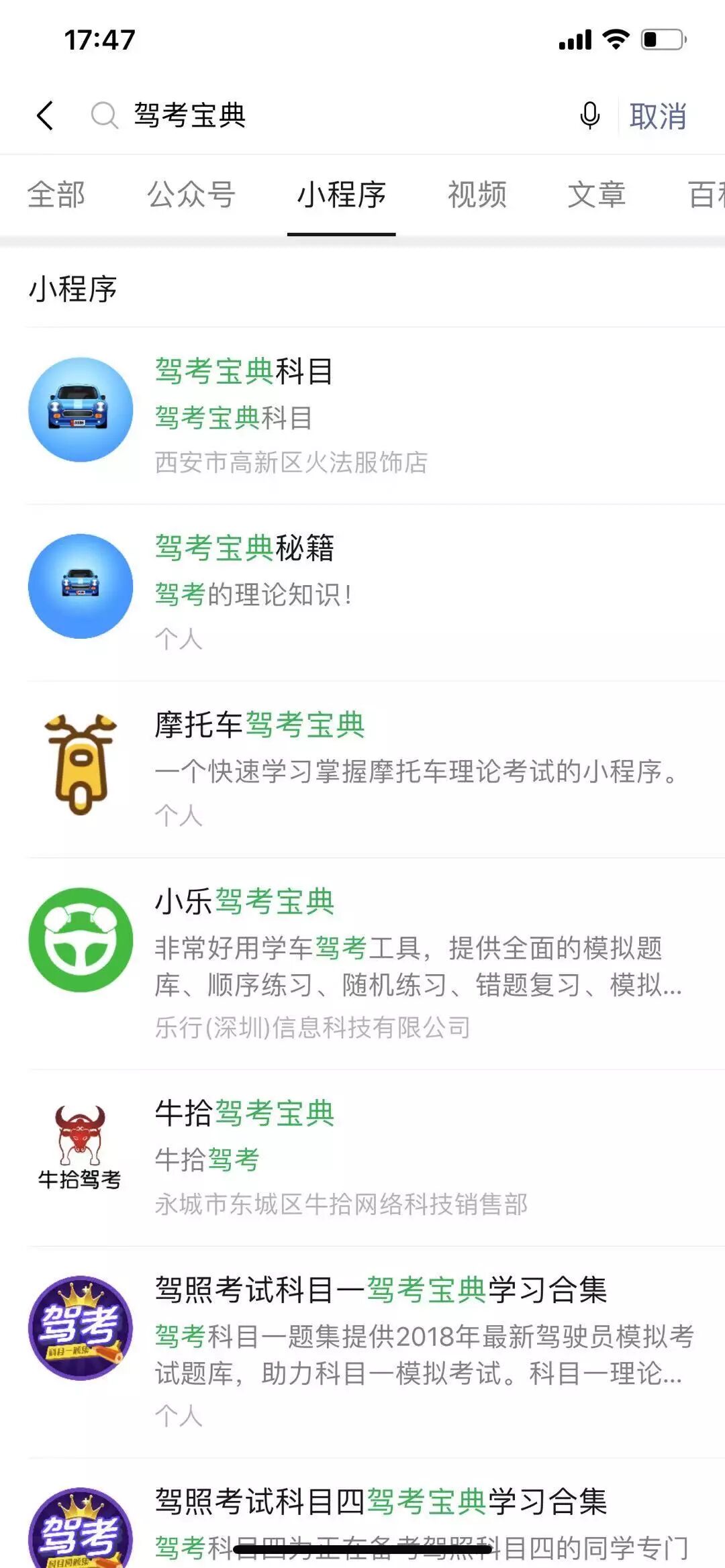 微信搜索,在小程序类别下搜‘驾考宝典’,搜不到驾考宝典,麻烦官方回复解决一下
