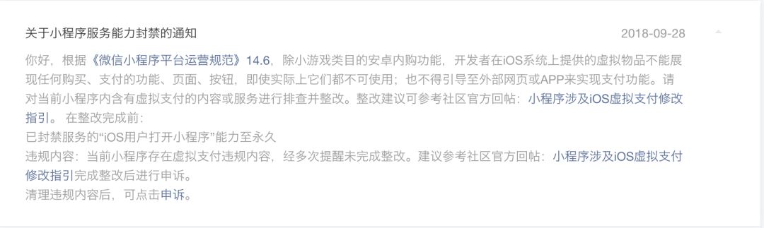 但在9月28日还是收到“iOS用户打开小程序”能力被封禁的通知,如下所示: