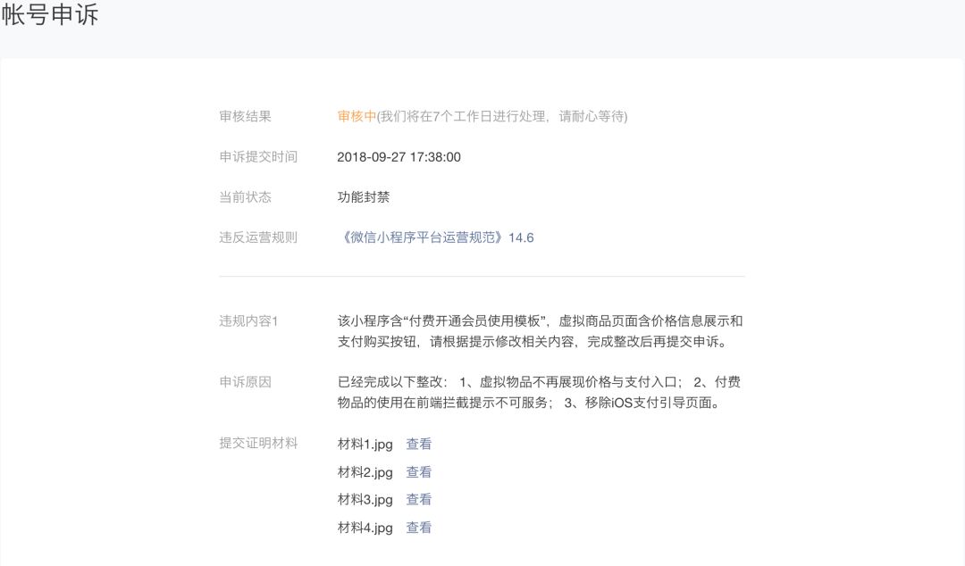 我方小程序9月20日收到虚拟支付整改通知,已在9月26日整改完成(整改截至时间为2018-09-27 13:20:26),并已发布新版,且审核通过已经对外发布。同时已经对处罚通知进行了申诉处理,当前状态仍为“审核中”,如下所示: