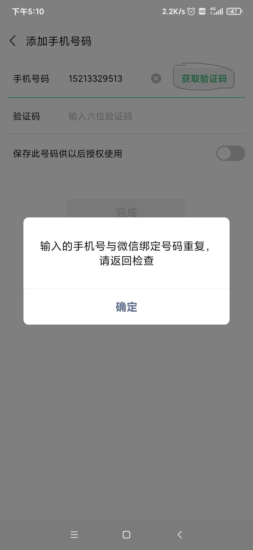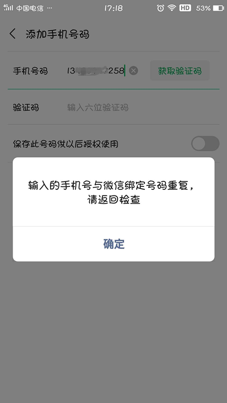 但是输入当前微信绑定的手机号码258又提示“与微信绑定的号码重复”,导致用户操作进入死循环进行不下去。