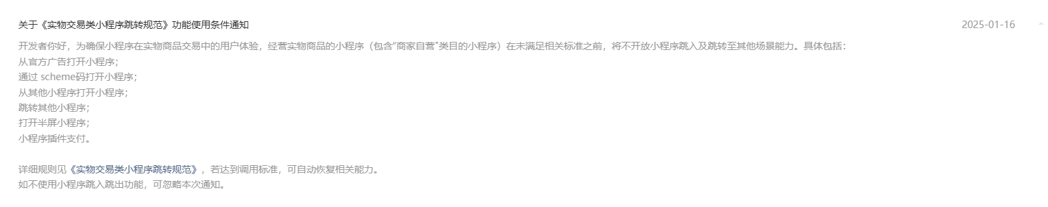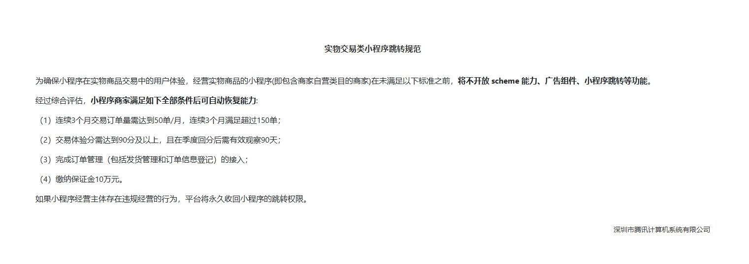 不过该调整只影响scheme 能力、广告组件、小程序跳转等功能,并不会影响小程序其他能力,不会影响到小程序的正常运营。