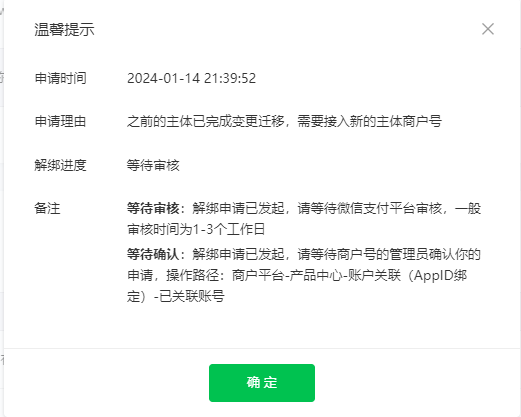 小程序主体变更,提交了申请函和变更函,审核公司通过了审核,但是绑定了原主体的商户号信息,当天已经让原主体商户管理员进行了解绑,但是现在有两个问题: