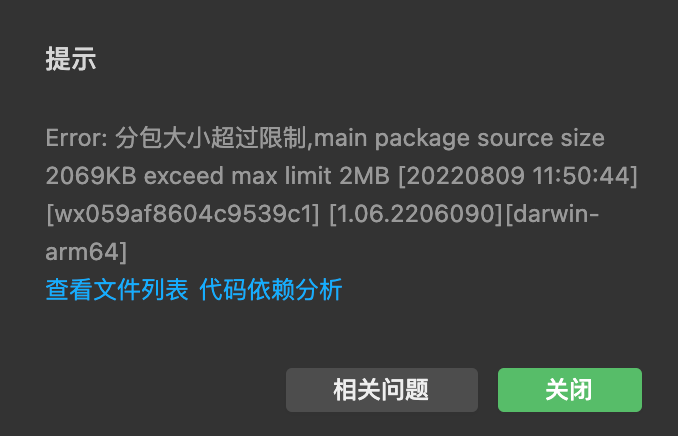Error: 分包大小超过限制,main package source size 2069KB exceed max limit 2MB [20220809 11:50:44][wx059af8604c9539c1] [1.06.2206090][darwin-arm64]