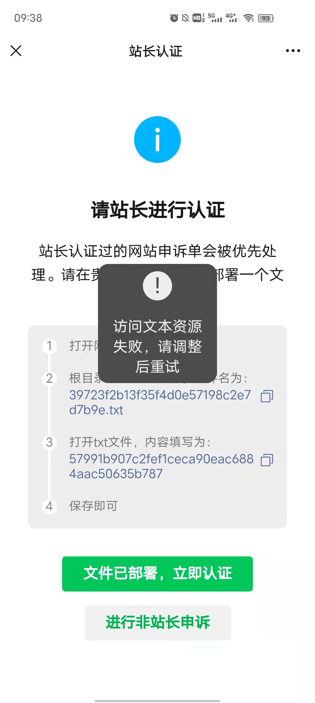通过站长申诉的方式提示“访问文本资源失败”