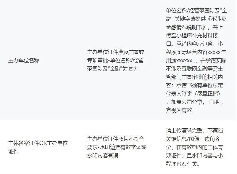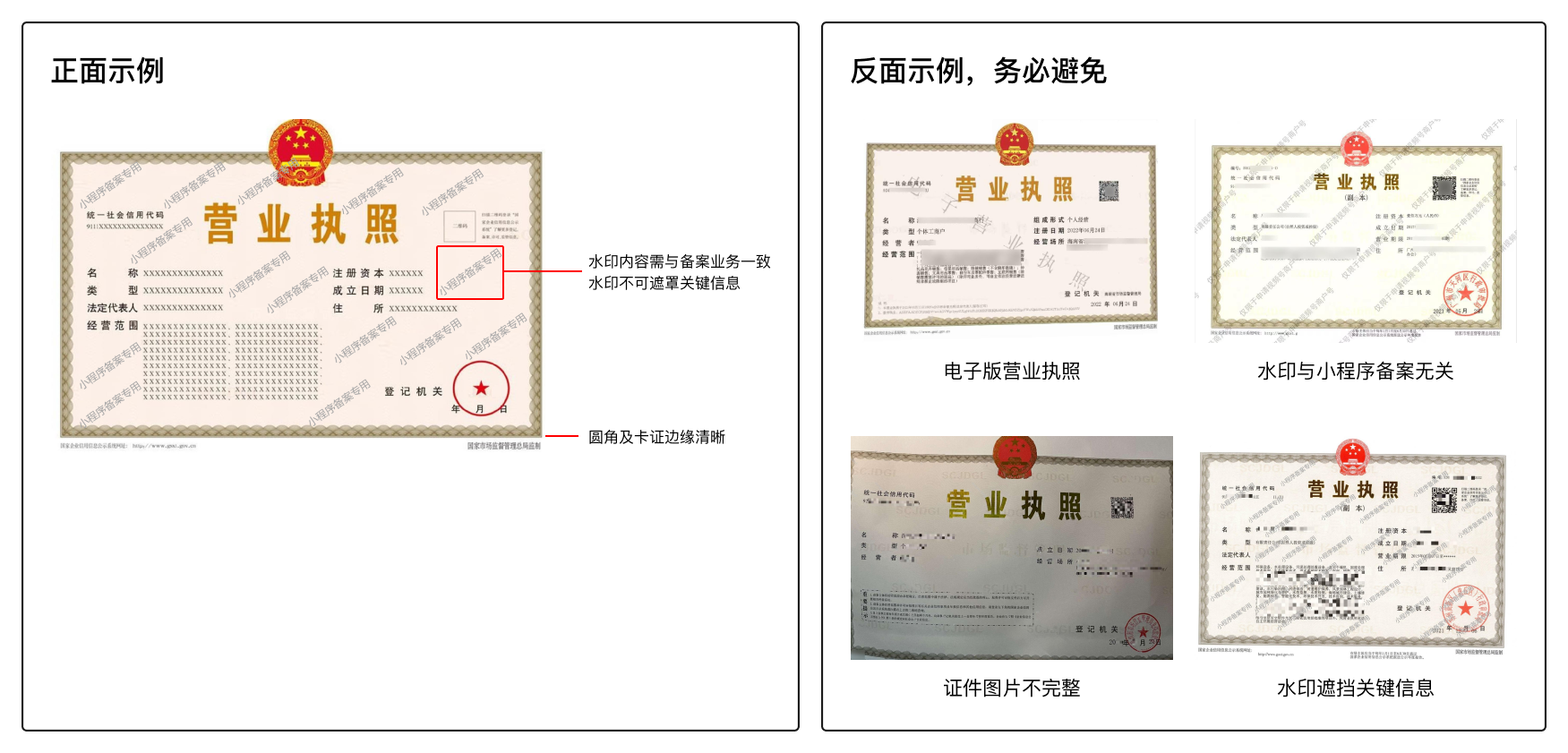 2.请上传清晰完整、不遮挡关键信息/图像、边角齐全、在有效期内的主体有效证件;且水印内容与小程序备案有关。请参考: