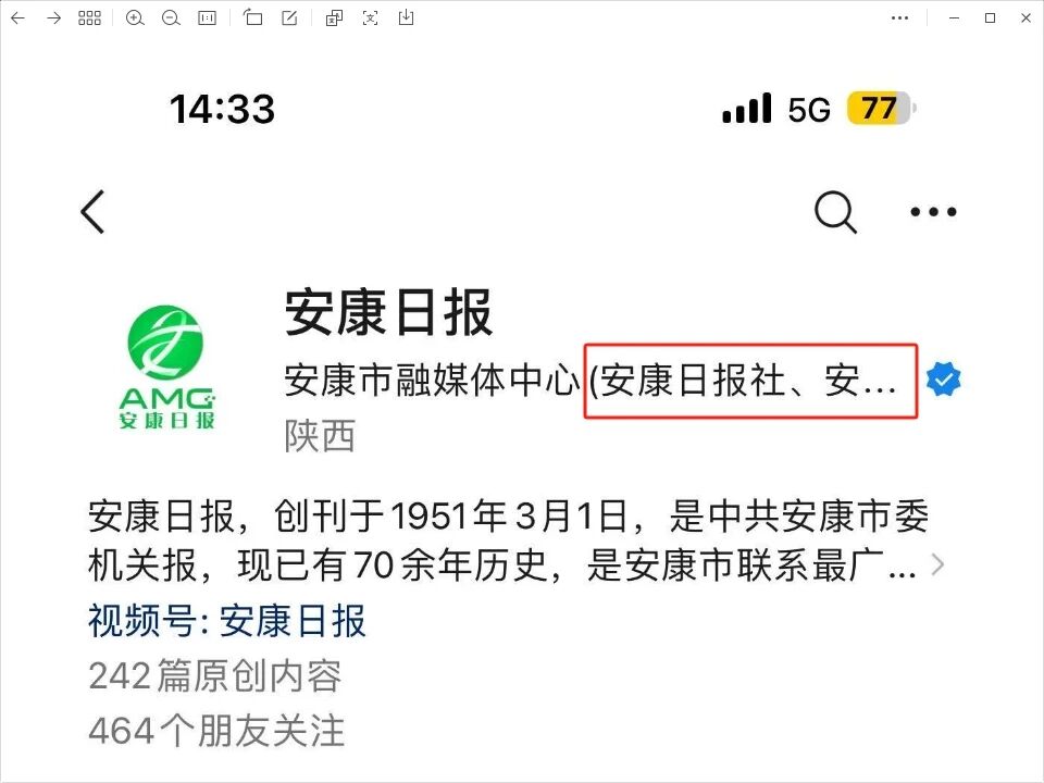 微信公众号:安康日报 ,申请修改主体名称:安康市融媒体中心(安康日报社、安康广播电视台),由于显示不全,请将主体名称修改为:安康市融媒体中心,不要括号内的内容。证书之所以有(安康日报社、安康广播电视台)是为了方便于国家出版署、国家广电总局的业务对接,所以都请将主体名称修改为:安康市融媒体中心