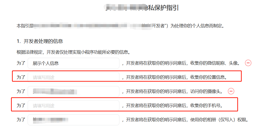 图中,我们新版本没有收集手机号、也没有获取位置信息,因此想把这两个权限删掉,但却无法删除。