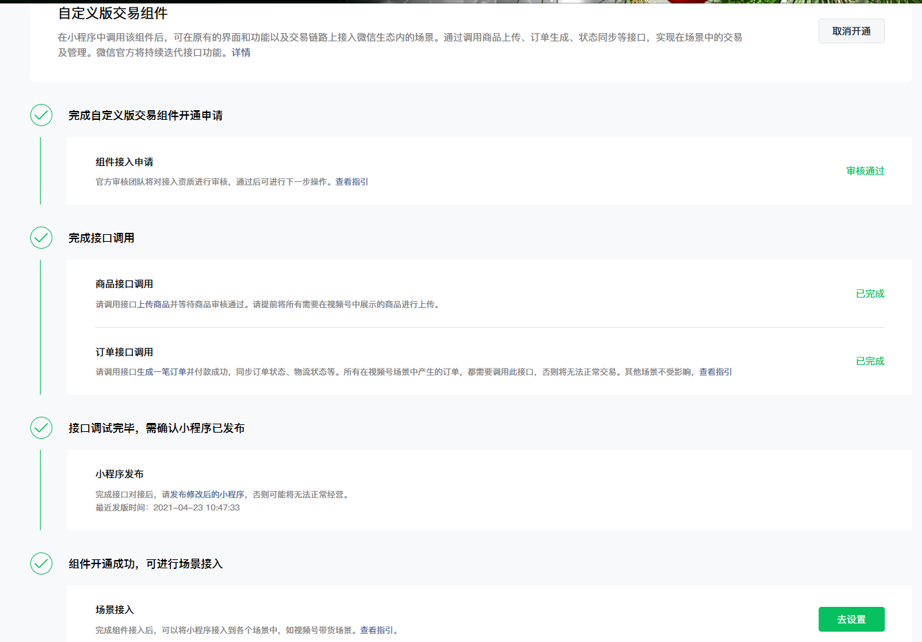 想问一下,怎么才能通过“完成接口调用”那一步?是一定要开通微信小商店?