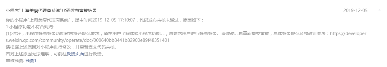 你好,经核实,你的小程序帐号登录功能暂未符合规范要求,请在首页补充说明使用帐号登录的原因,让用户了解具体服务功能后,再引导用户进行帐号注册或帐号登录。请整改后再重新提交审核,具体登录规范及整改可参考:https://developers.weixin.qq.com/community/operate/doc/000640bb8441b82900e89f48351401(详图如下)