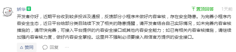 关于小程序介入内容安全能力的警告通知,我们小程序一直都是有反垃圾机制和内容审核机制的,反垃圾机制引用百度反垃圾机制。存在违规的图片无法上传成功