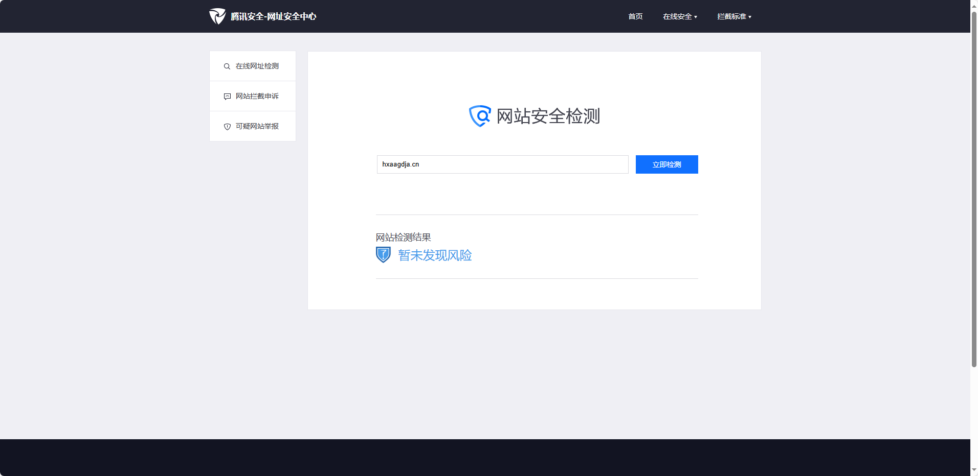 在腾讯安全-网址安全中心查询提示暂未发现腾讯网址安全中心拦截;