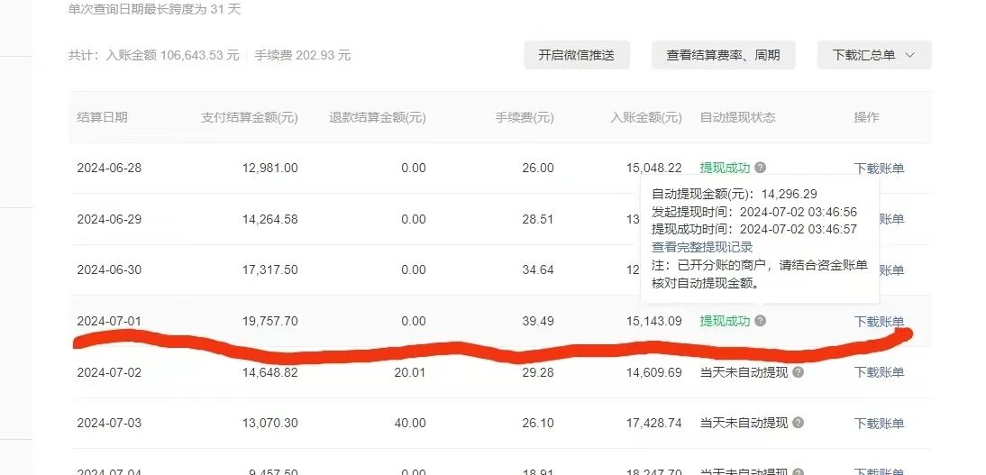 7月1号,其中支付结算金额和手续费根据对账单能看出怎么算的,但是入账金额和自动提现金额不知道怎么算,我们算的和官方的对不上。
