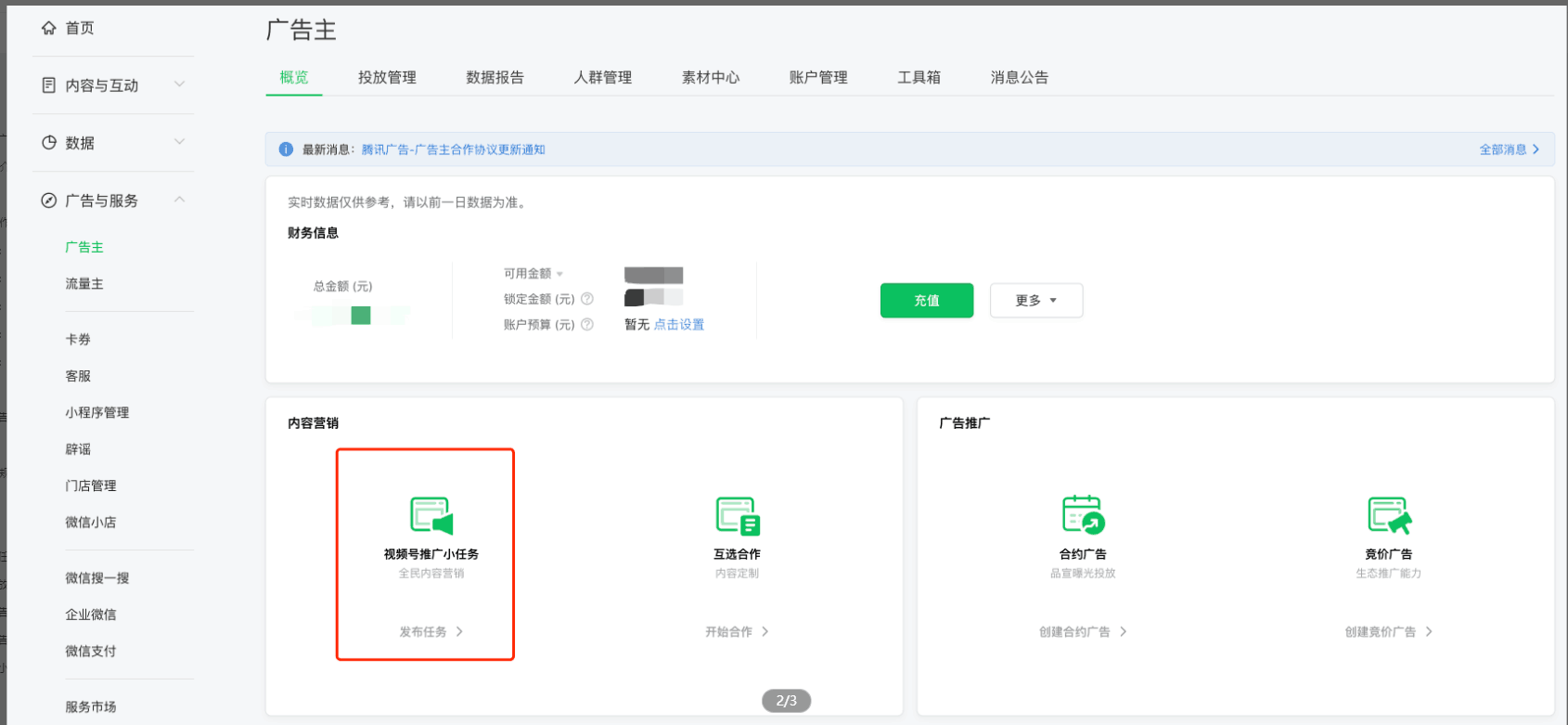 你好 我们在后台广告主模块里面没有找到视频号推广小任务窗口,我们企业已经审核通过了视频号,和微信小游戏后台企业主体一致,这个是我们看到示例文档里面的截图,,但是我们后台没有这一模块,如图,请问这个是什么原因?