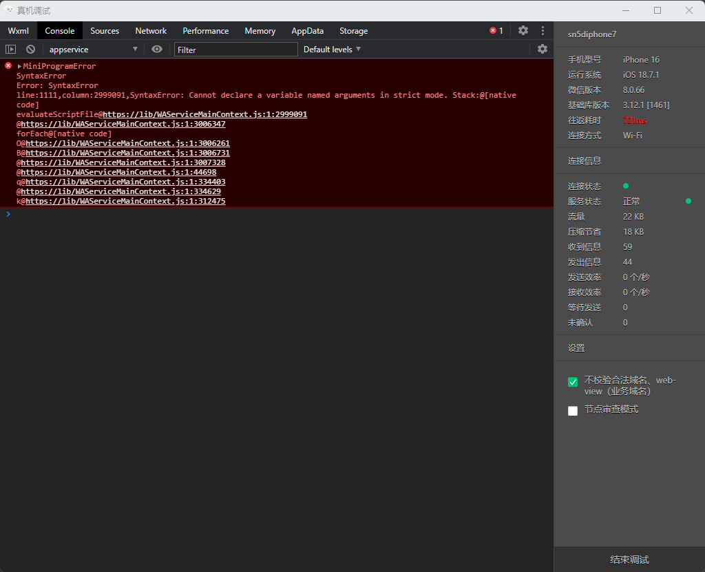 开发一个插件,在真机调试过程中安卓是ok的,ios时常打不开页面报错:Cannot declare a variable named arguments in strict mode. Stack:@[native code] (代码里检查过没有es6的相关语法了) ,但是ios有时也能打开(打开的步骤:清除手机微信缓存-> 删除小程序 -> 扫码预览 -> 真机调试 这是能打开的唯一步骤)。