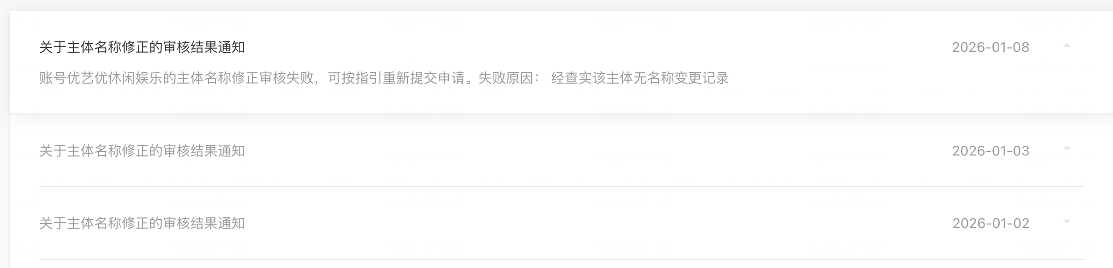点击去更新之后申请失败,失败原因:经查实该主体无名称变更记录