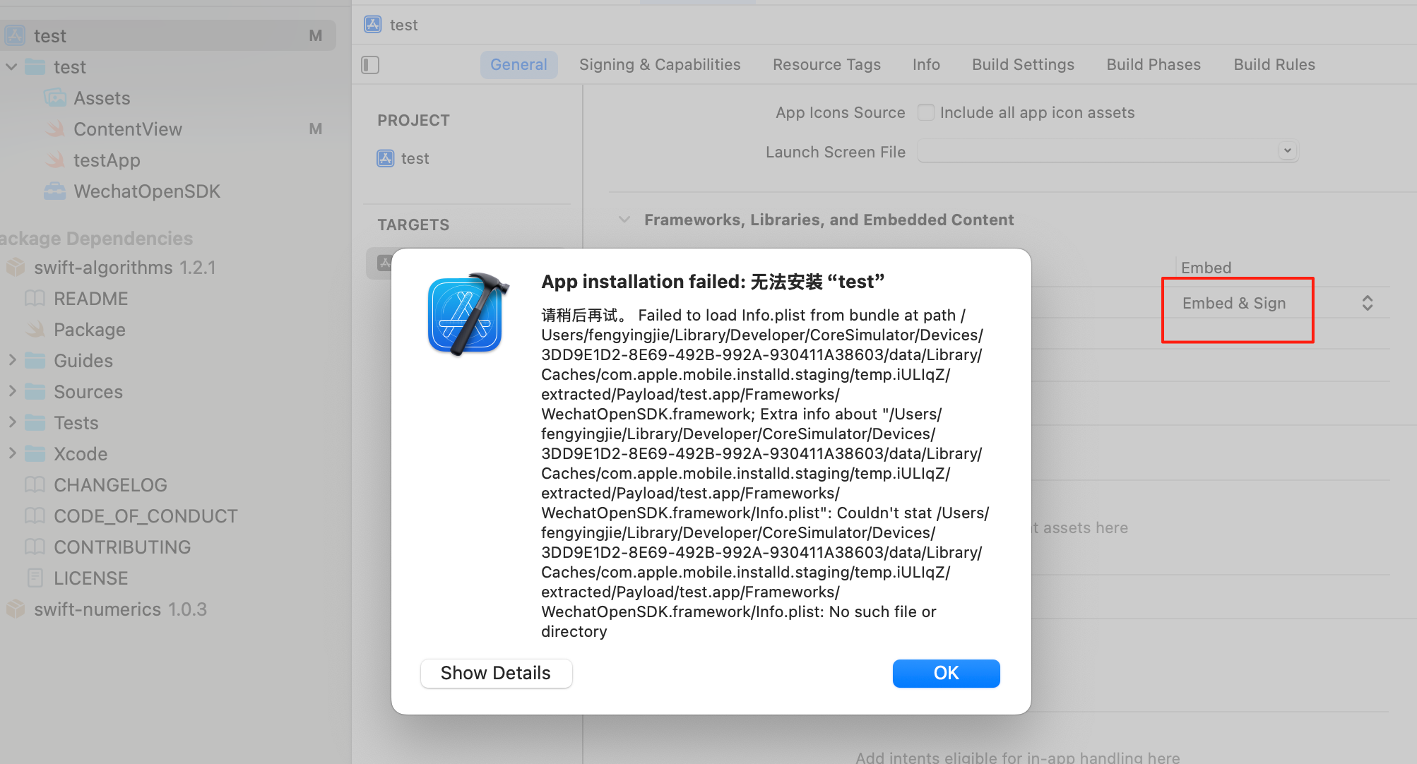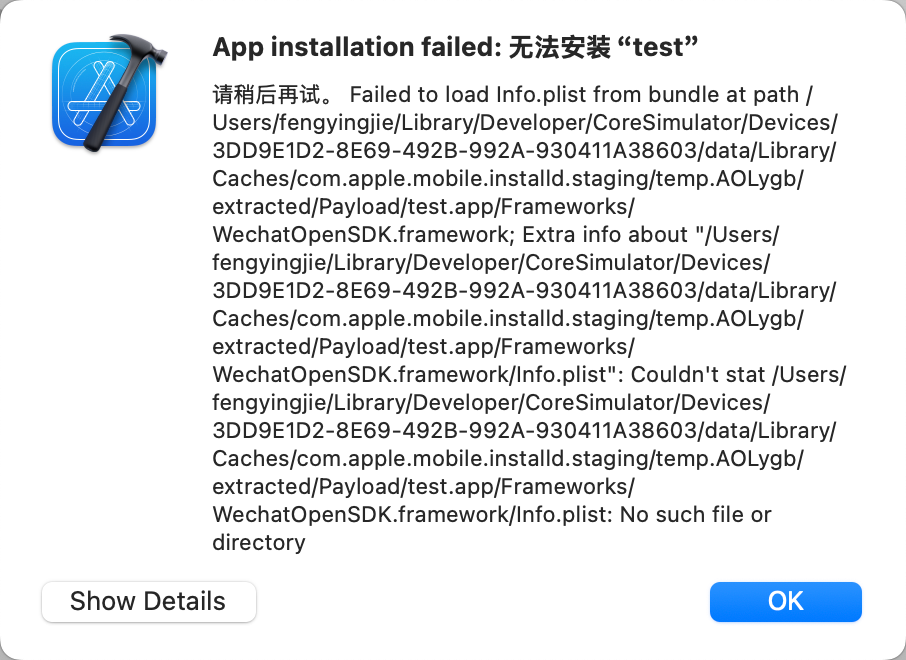 Recovery Suggestion: Failed to load Info.plist from bundle at path /var/installd/Library/Caches/com.apple.mobile.installd.staging/temp.blsPQ7/extracted/china-unified-app-ios.app/Frameworks/WechatOpenSDK.framework; Extra info about "/var/installd/Library/Caches/com.apple.mobile.installd.staging/temp.blsPQ7/extracted/china-unified-app-ios.app/Frameworks/WechatOpenSDK.framework/Info.plist": Couldn't stat /var/installd/Library/Caches/com.apple.mobile.installd.staging/temp.blsPQ7/extracted/china-unified-app-ios.app/Frameworks/WechatOpenSDK.framework/Info.plist: No such file or directory