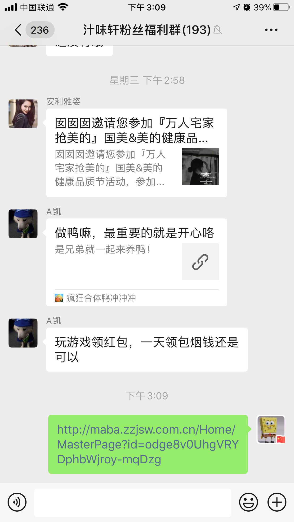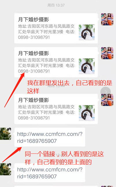 我的链接是:http://www.ccmfcm.com/?rid=1689765907,通过分享到群,自己看到的是正常的,但别人看到的是链接,