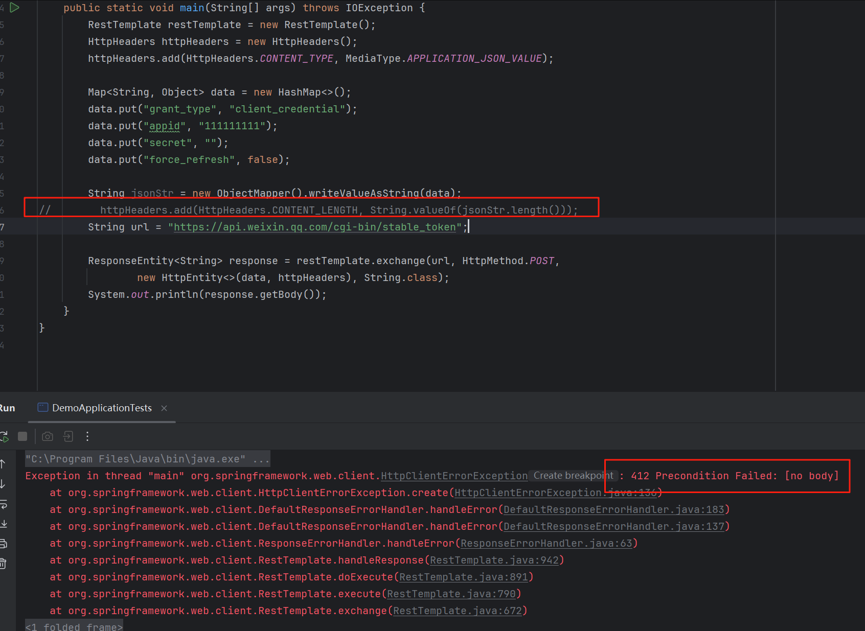请求头content-length 不正确就会412。spring boot 3版本以上,某些版本不会计算content-length,测试用例的版本是3.2.6