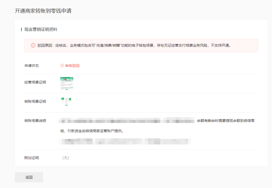 业务模式包含可“充值消费/转赠功能的电子钱包场景,存在无证经营支付结算业务风险,不支持开通