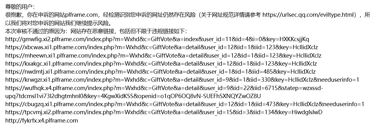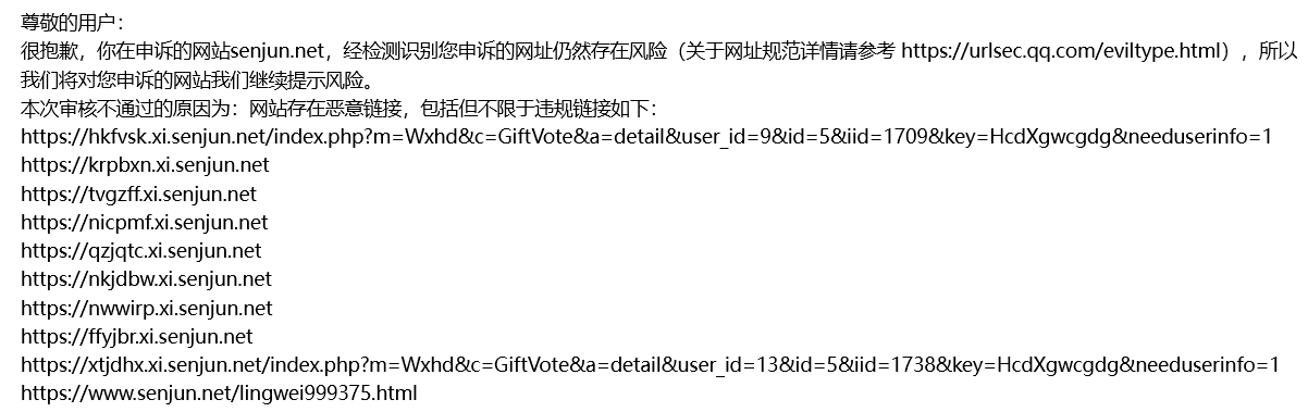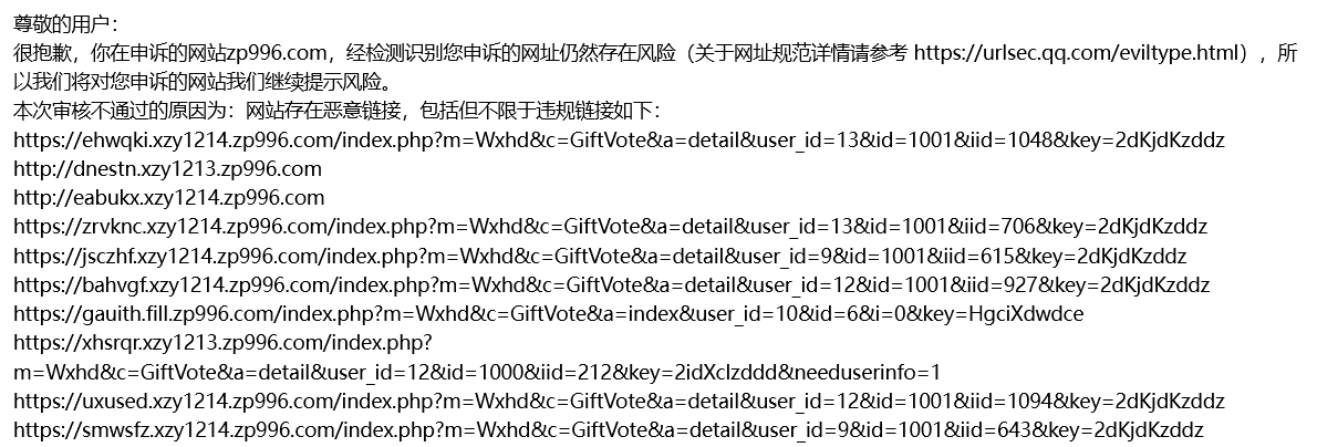 我们一直有在积极认真自查并提交申诉邮件的,可你们每次回复过来的邮件全部都是一模一样的,哪怕是将邮件里面附带的内容链接顺序打乱一下我们都会觉得你们是有在认真审核的,我就想请问下你们负责审核的人,如此的敷衍了事对于我们这些用你们平台的客户来讲真的好吗?真的不会让人心寒吗?别说是你们邮件里面附上的所有链接了,几乎是这三个域名下面的所有90%以上的解析记录都已经全部删除掉了,可你们的申诉回复邮件里面内容仍然是上面的说辞,在此我就想求一下各位审核的大人们,能否明确指出来一下到底是哪个页面,哪个链接仍然存在你们所认为的违规内容的,要不然我们现在真不知道要再如何自查下去了,相当于这三个正常用了四五年业务域名,现在就是彻底的无用了,与之相关的业务也都得要重新调整,重新跟我们的客户进行一一解释道歉,请问你们有没有考虑我们的感受的?