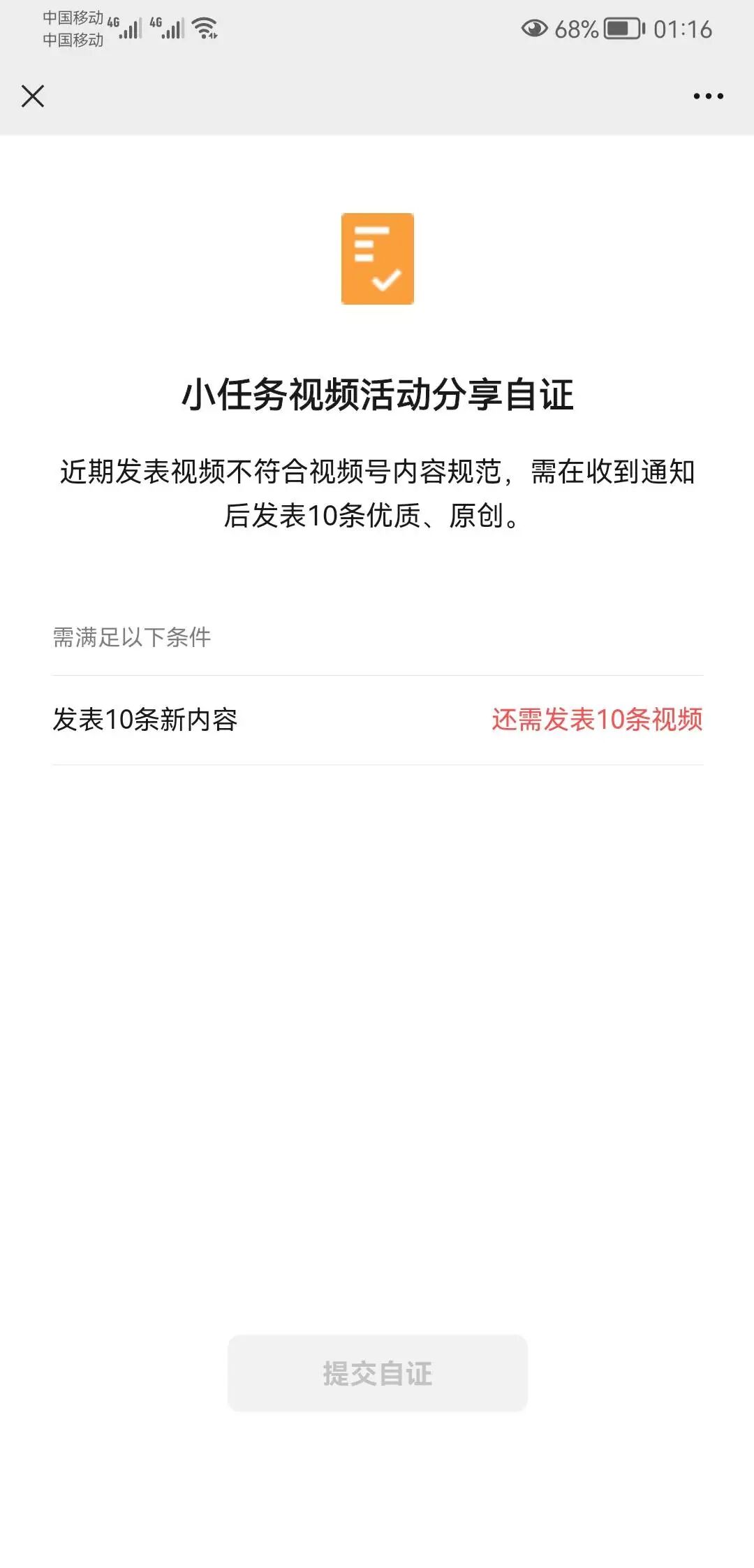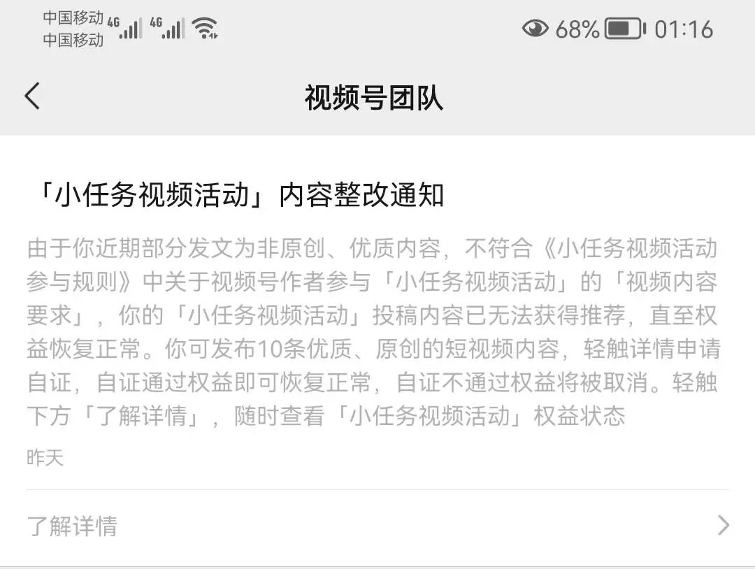 我的微信视频号没有报名参加「小任务视频活动」,可是却收到了后台发送的小任务视频活动内容整改通知说我的视频非原创、优质内容,不符合《小任务视频活动参与规则》,可是我的视频都是原创的,想问下有人是什么原因吗?
