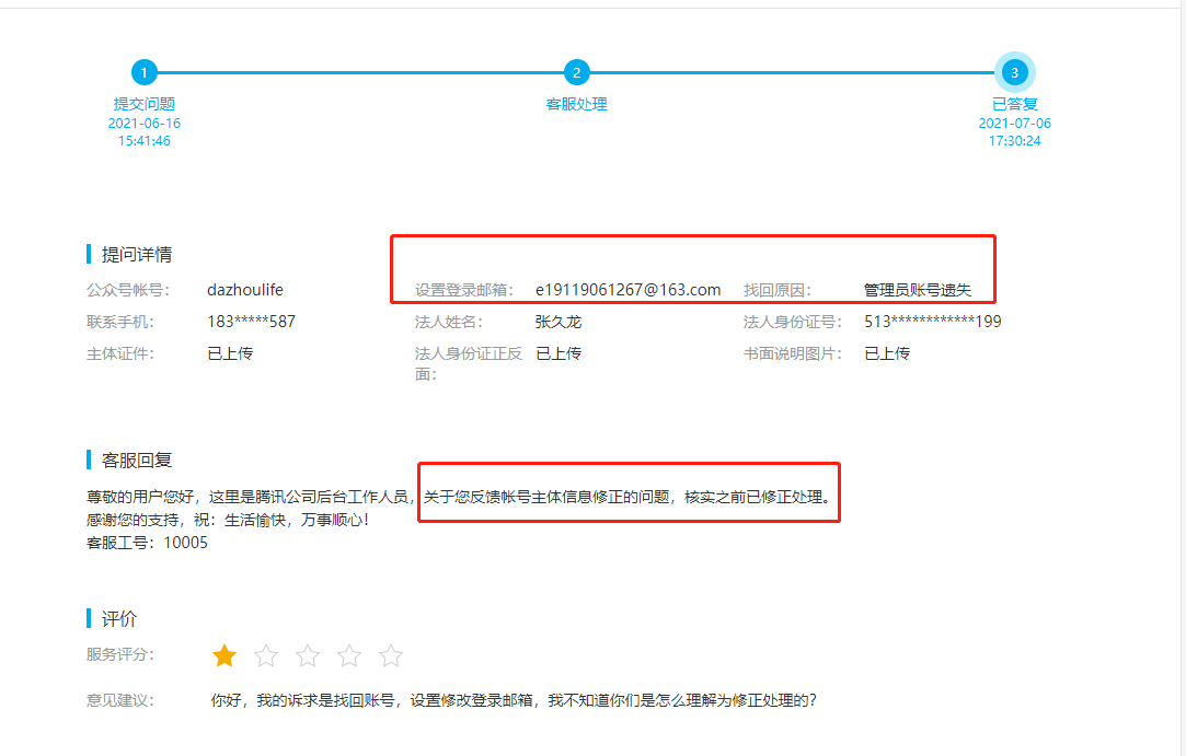 因为这个号的管理员微信号遗失了,想重置管理员,结果提示“账号异常,不支持找回,请联系腾讯客服”。联系人工处理后,本来是想重置管理员,处理结果变成修改公众号主体,是不是客服搞混了?这个一次提交要等20天,能不能麻烦客服帮忙看一下怎么弄。提交问题的QQ是121456833