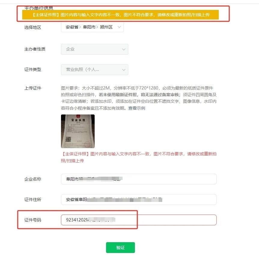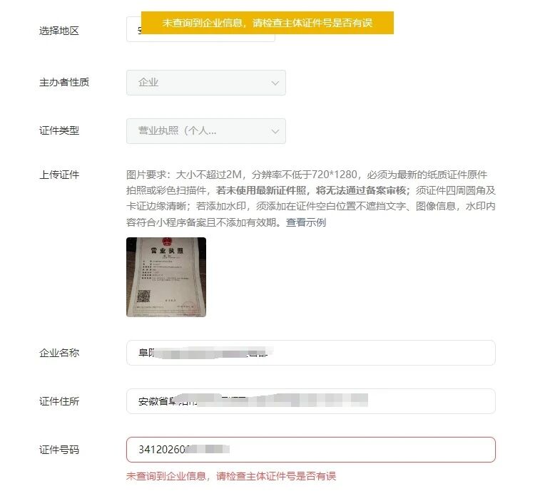问题描述:客户是2016年的老版的个体工商户营业执照(营业执照有注册号,没有统一社会信用代码)。微信认证通过。备案出现一下问题:1.自动识别提示查询不到信息(经测试是因为识别到的注册号,不是统一社会信用代码)2.手动复制填写了统一社会信用代码后提示证照信息不一致。如下图: