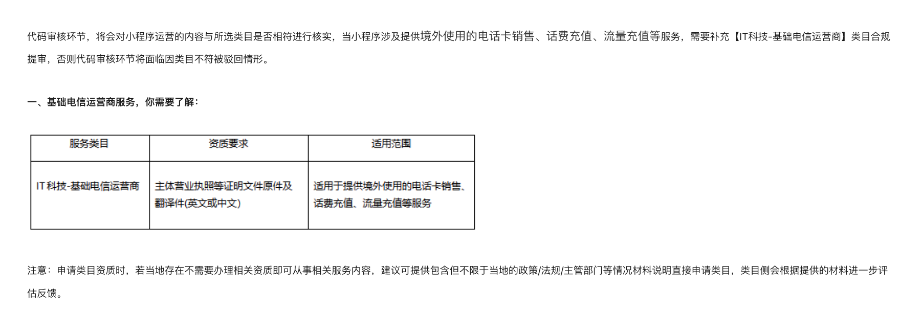 我们小程序主要是做国际旅游卡充值,我按照流程去添加《IT科技-基础电信运营商类目》,根据https://developers.weixin.qq.com/community/develop/doc/000c2ede5988b033bf8e5070c51c09?highLine=%25E5%25A2%2583%25E5%25A4%2596%25E6%25B5%2581%25E9%2587%258F%25E5%2585%2585%25E5%2580%25BC上传营业执照被驳回了,原因是需要提供(基础电信运营商提供:《基础电信业务经营许可证》)或运营商分/子公司提供:《营业执照》(含相关业务范围)),可这个许可证只有运营商才有