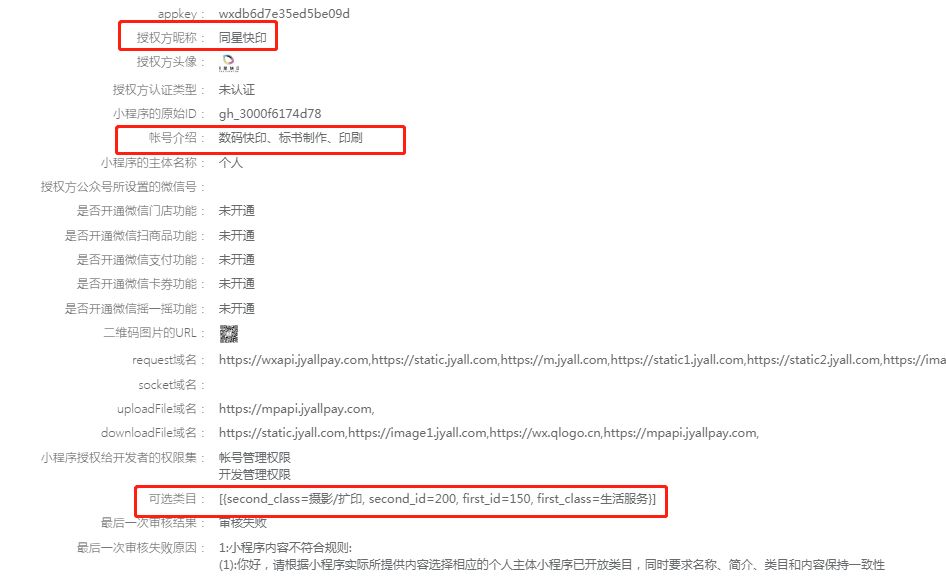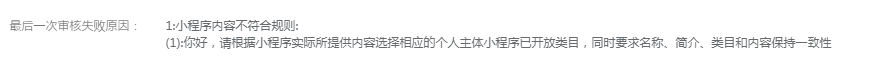 但是经过个人类目查询后发现小程序设置的类目简介一致如下: