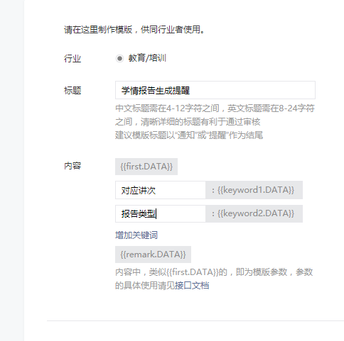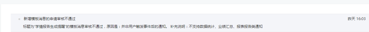 2)请运营者正确理解平台的模板消息接口能力。模板消息是需要用户与业务之间存在实际交互行为,即时触发即时触达相应服务结果,不等同于短信作用,不作提醒用途。目前均不支持数据统计、报表报告类没有用户上行的通知;