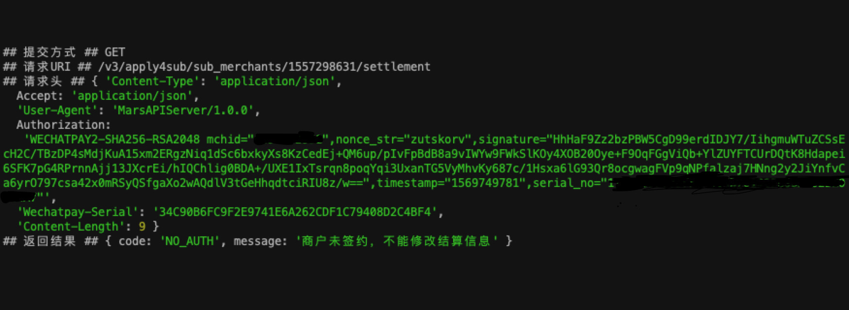 { "code": "NO_AUTH", "message": "商户未签约,不能修改结算信息" }