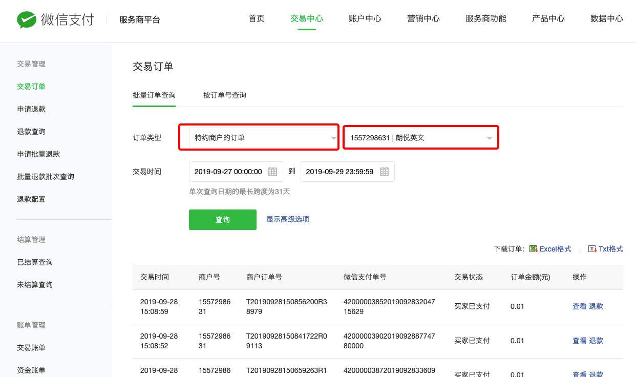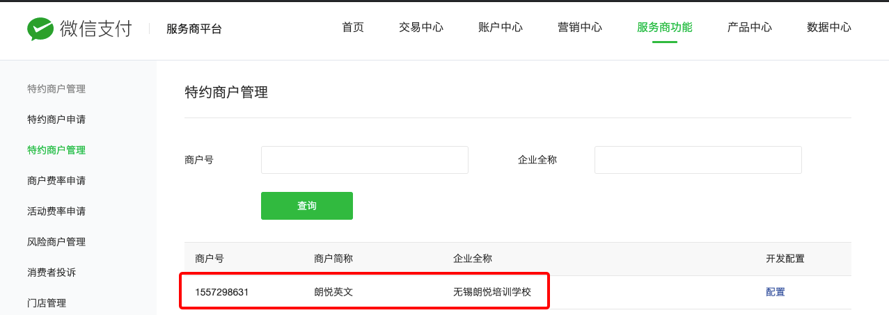 微信支付 - 服务商商户 - 服务商功能 - 特约商户管理 列表页面显示正常;