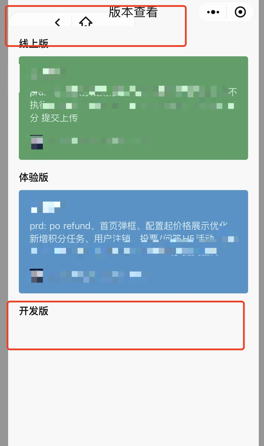 小程序助手,点击“版本查看”,1)开发版内容不展示 2)点击左上角返回按钮,无反应