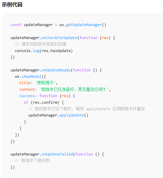 所以,文档给的示例代码也没用这个字段判断是否提示更新,而是,直接用onUpdateReady判断是不是需要更新小程序。辣鸡微信。