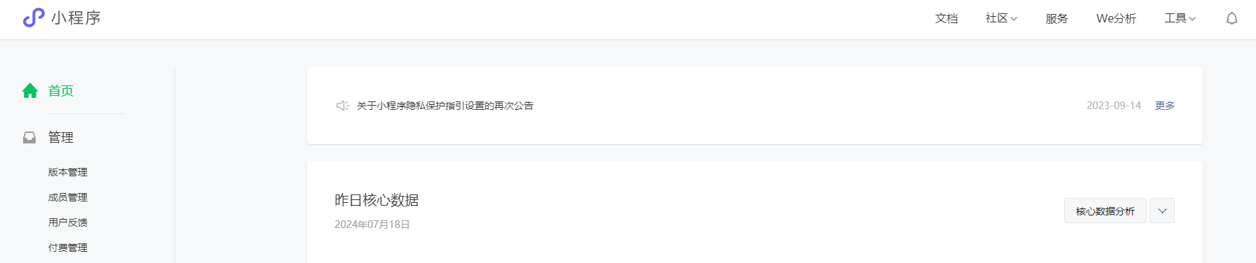 网页登录:https://mp.weixin.qq.com/,选择【账号密码登录】,输入你注册的小程序邮箱、密码登录,就会进入小程序后台(不要用公众号邮箱、密码);小程序后台是这种