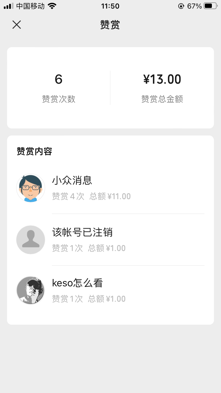 我从这个赞赏内容展示,出现在个人微信版本内,这微信版本不断更新了很多个最新版了,都没设计上人性化一下。