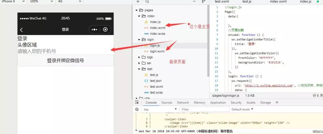 而您现在看到的 注册|登录 是小程序主页。 也就是说 注册 登录 的逻辑下载login.js 里面。我现在要改变的index.wxml。![]()