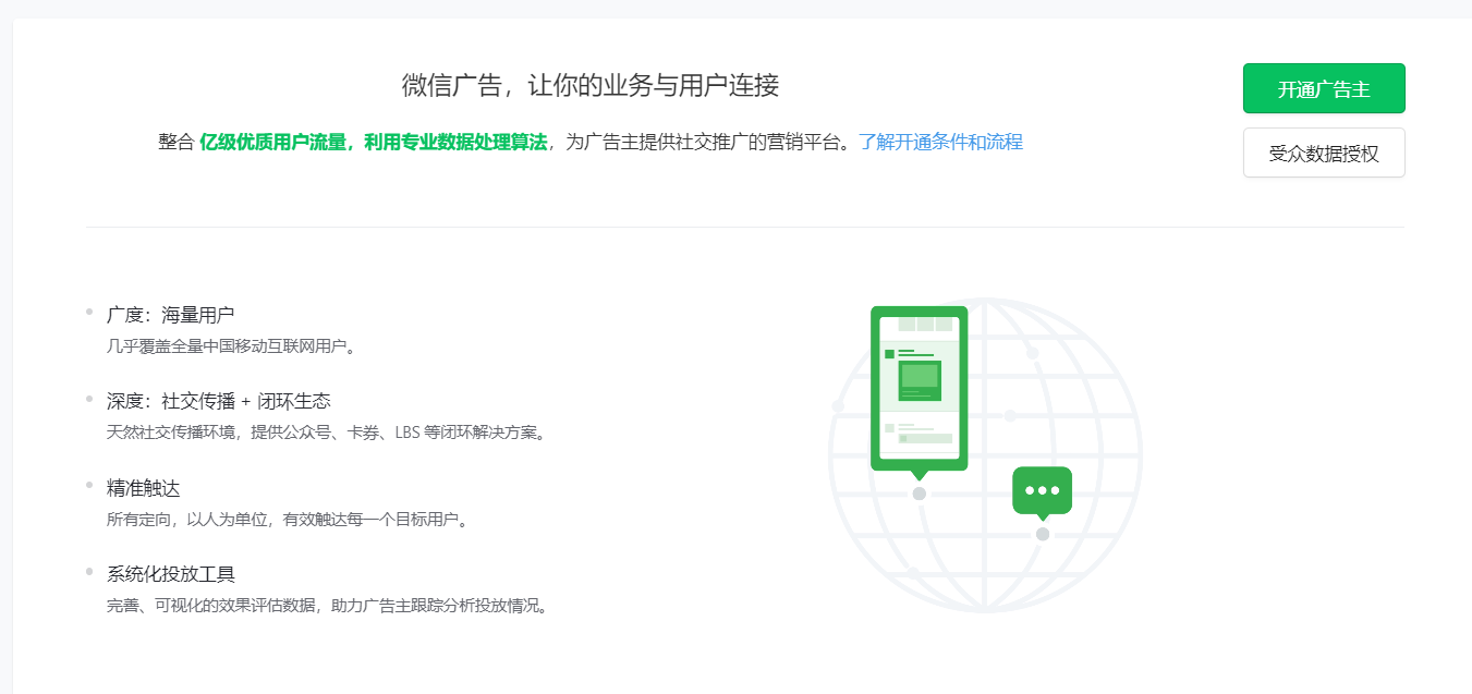 开通条件和流程 https://ad.weixin.qq.com/guide/116