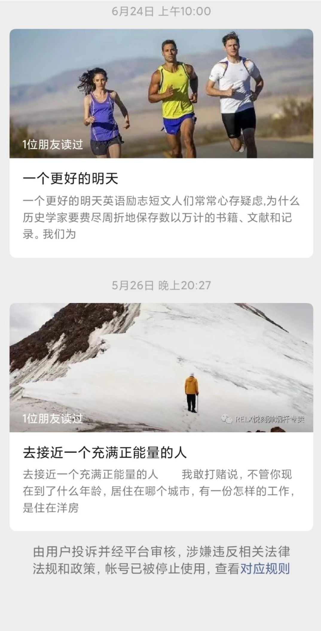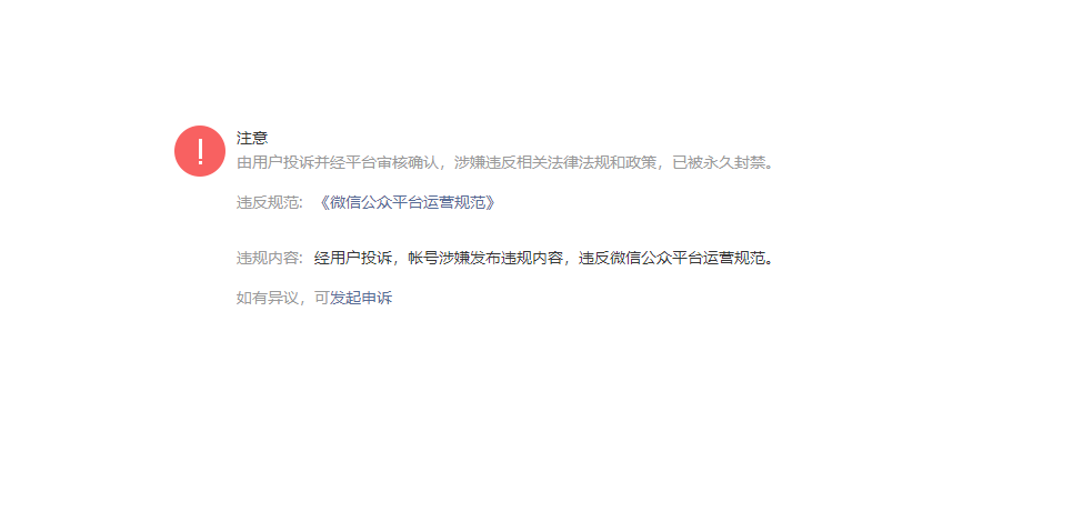 未发表违规内容还被经用户投诉,帐号涉嫌发布违规内容,违反微信公众平台运营规范,励志中英短文章哪里有问题了要哭死了。。同行恶意投诉被封,疫情间做点兼职直接封了让人活不了,你们随意一封就是一个家庭的灾难,有没有人核实下处理。用心运营3月就落得这样一个下场。