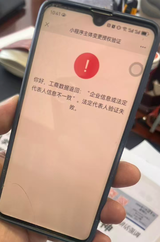 小程序主体变更,在授权认证阶段,目标主体法定代表人扫码验证提示“你好,工商数据返回:“企业信息或法定代表人信息不一致”。法定代表人验证失败。”