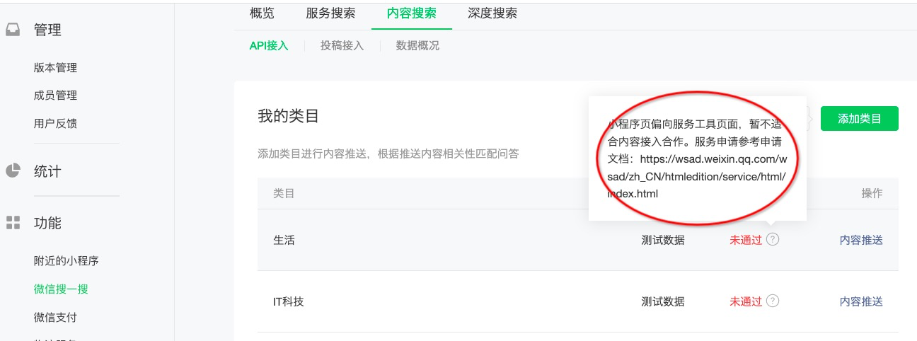 【背景】小程序属于回收行业、3C数码市场回收价格查询等服务行业,为什么在服务类目申请通过的,在小程序的搜索板块“内容搜索”服务板块的审核不过,规则里说明了,小程序的内容搜索,需有相关的服务类目添加成功,但是添加审核成功了,但是内容搜索是说不支持,为啥?相关截图如下: