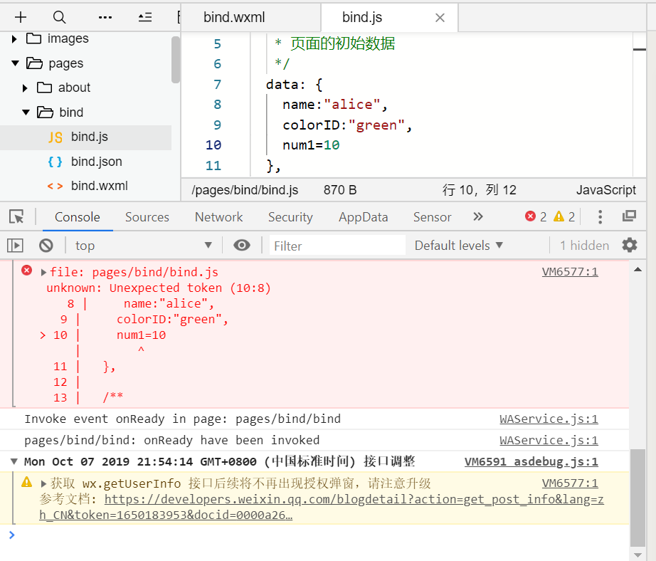 在js中的data里写了num1=10,作为wxml页面的取数,结果就报错了,num1=10这样赋值的写法应该怎么写?求大神指点,谢谢。