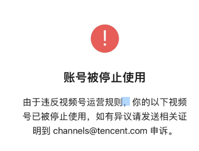 1、在被停用前和停用后(直到现在)没有收到违规的提示,视频号消息、微信消息、手机短信息均没有收到任何的消息,并不知道具体违反了什么的规则,微信视频号作为一个正规的视频平台方是有义务告知视频博主具体原因的。不仅是体现平台方的责任,也是对一个用户甚至说是对一个人起码的尊重。合理合法的做法应该是视频号能够依法依规判别违规行为,并给用户提示、警告、处罚,对于违规判定能够给出具体的违规证据,不是靠机器审核自动判定,也不是靠人工审核的个别人员主观判定,更不能是粗暴的把账号关停了事。