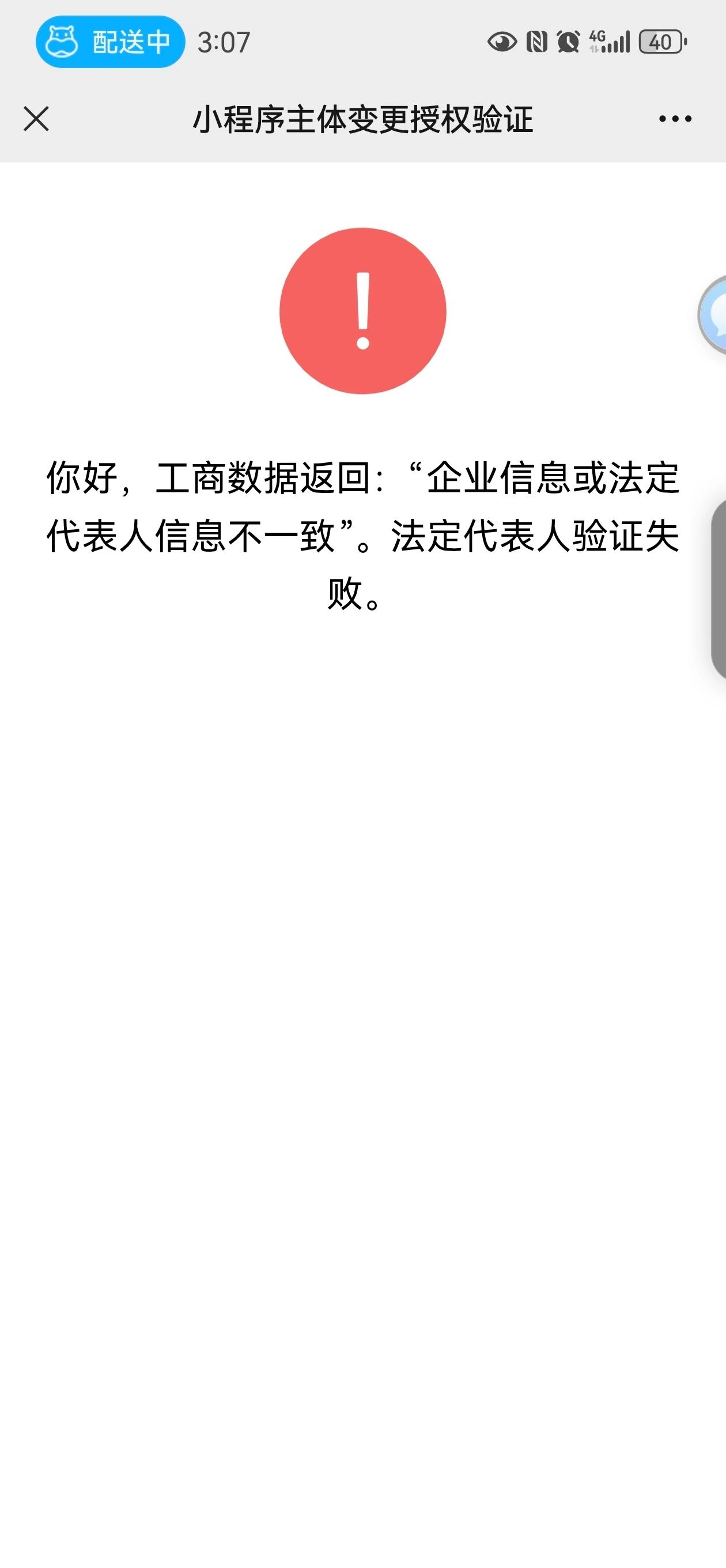 小程序主体变更,目标法人扫码老是这样。提示企业信息或法定代表人信息不一致”。法定代表人验证失败