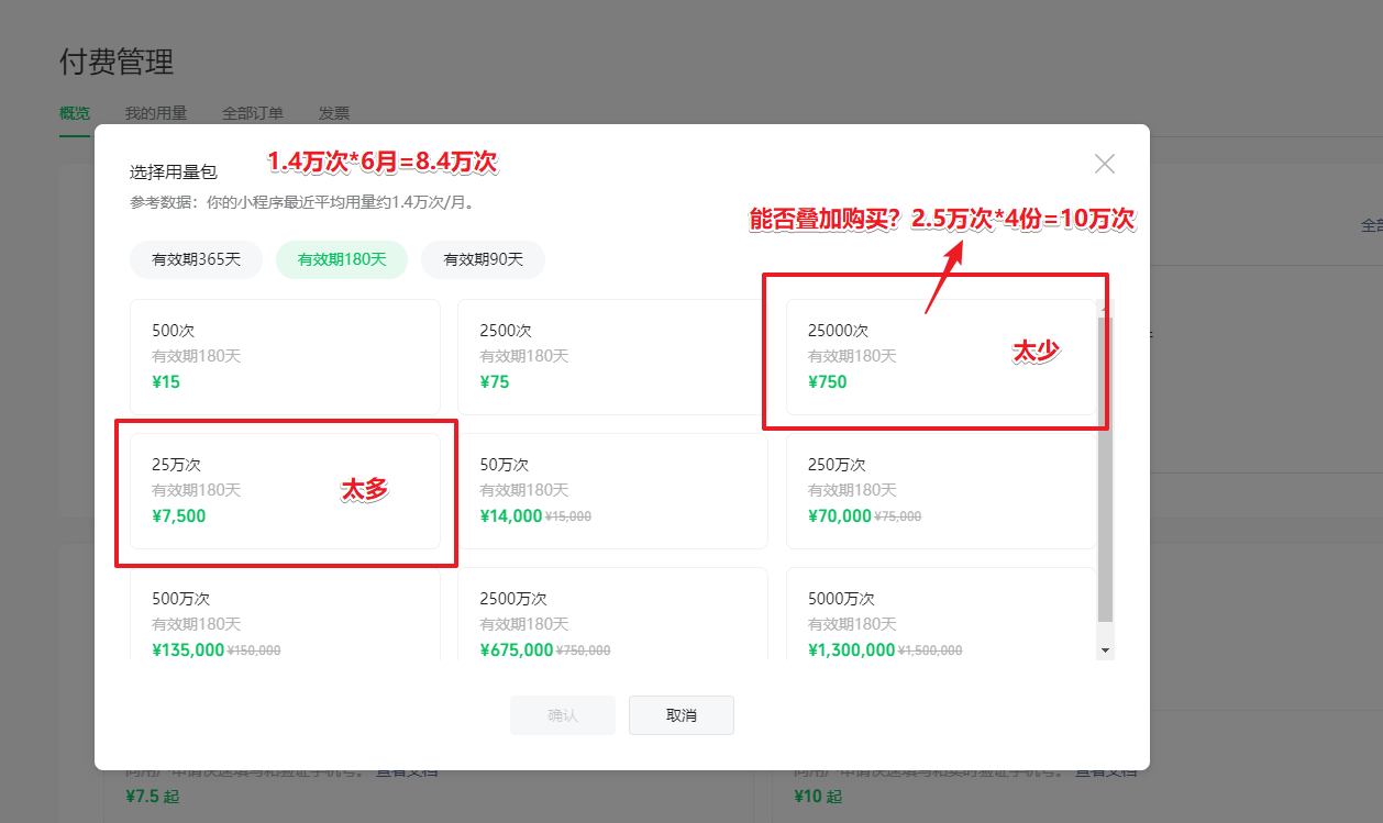 平均1.4万次/月,准备买180天约6个月。1.4*6=8.4万次。