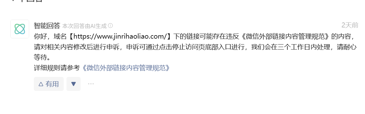 你好,经核实,域名【jinrihaoliao.com】下的大量链接【https://byu7yup117p.jinrihaoliao.com/pubhw/authormain?adminid=b7c3f60aceb84614af478250b9f0ff93_hw&svapid=wx41111bafcb9082b0&time=1758537793989】的内容违反《微信外部链接内容管理规范》的第19条“恶意对抗类内容”,属于严重违规,无法恢复微信内直接访问的服务。