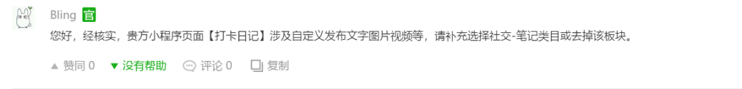 你好,经核实,贵方小程序最新提审版本代码涉及打卡日记问题,需补充社交-笔记类目,或请自查代码,确保包括前端展示、小程序代码等整体均移除相关内容后,再提交代码审核。