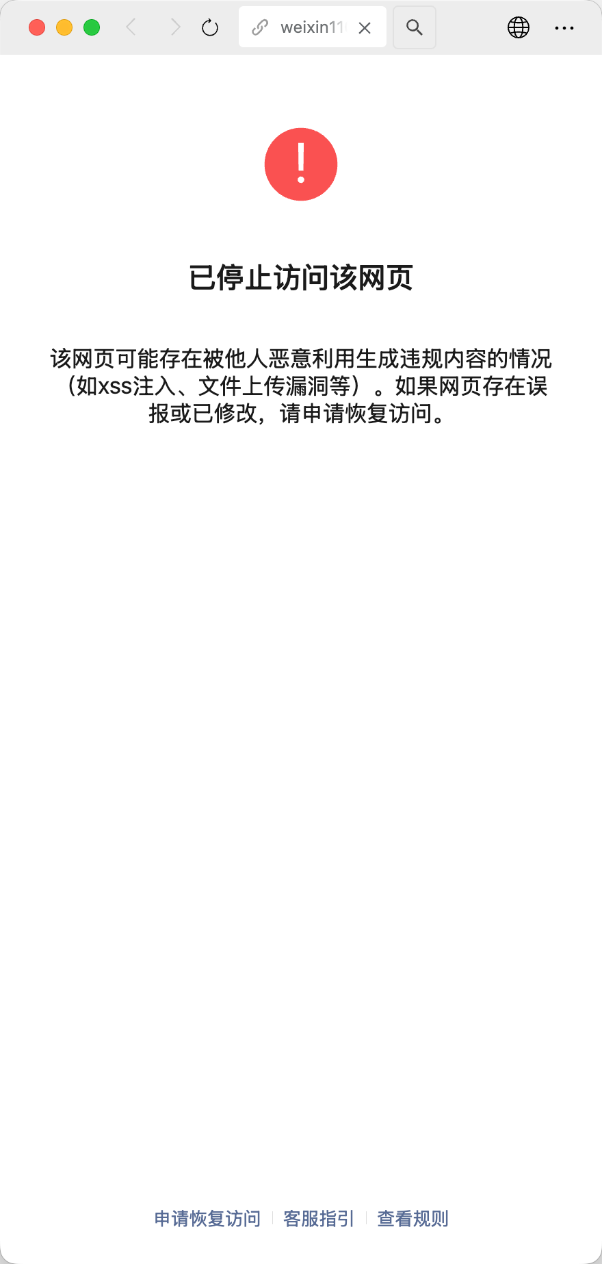 打开网页提示:该网页可能存在被他人恶意利用生成违规内容的情况(如xss注入、文件上传漏洞等)。如果网页存在误报或已修改,请申请恢复访问。