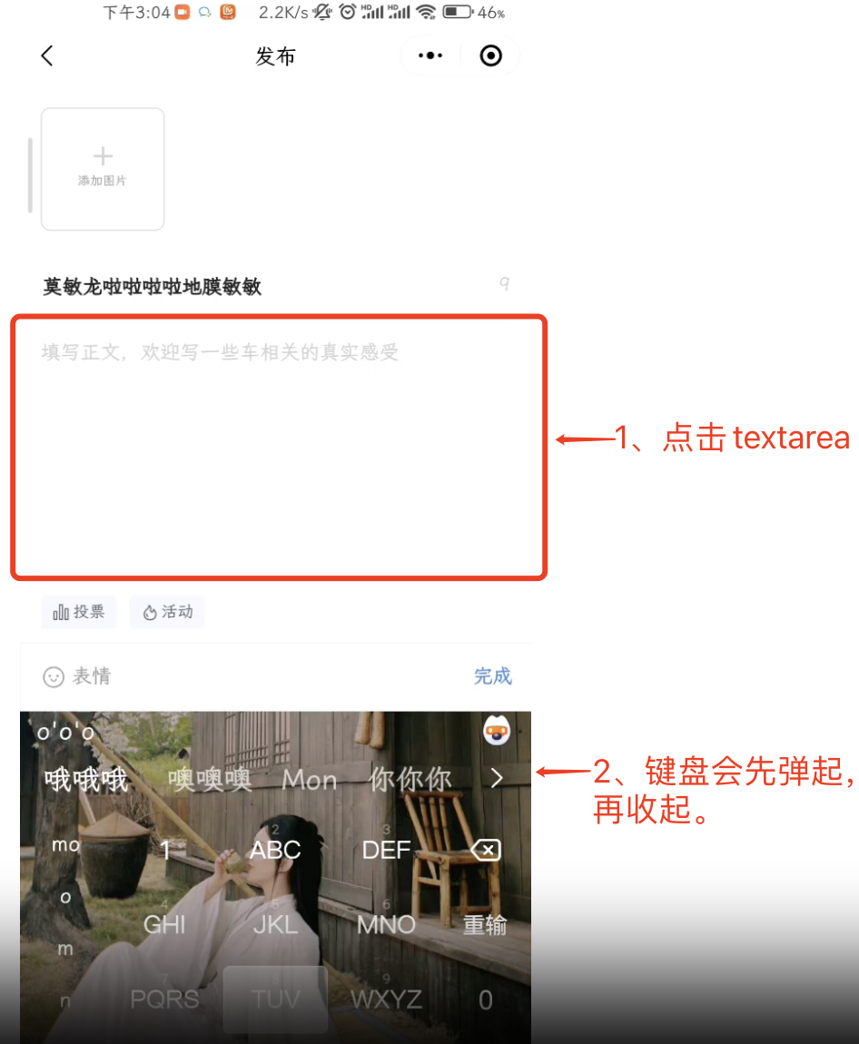 刚进入小程序,第一次点击textarea,键盘立刻弹起,但是马上闪退。点击第二下的时候就好了。