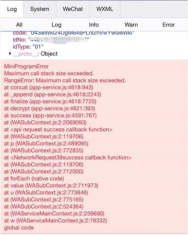 iOS手机下,微信小程序的体验版/正式版 调用 正式环境的一个接口会报这个错误,其他接口以及测试环境 、正式环境的真机调试 都不会报错。